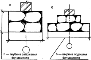 Існує безліч видів фундаментів, проте розглянемо прості, вживані для будівництва житлових будинків малої поверховості. Жорсткі стрічкові і стовбчасті фундаменти виконуються з бетону, бутобетону, бутової кладки, тобто з тих матеріалів, які добре працюють на стиснення. Бутова кладка ведеться на цементному розчині або складному цементному розчині. Заздалегідь проектом визначається площа підошви фундаменту і всі характеристики ґрунту (тиск на ґрунт підстави, об'ємну вагу між матеріалом фундаменту і ґрунтом, а також глибина заставляння). Більшість ґрунтів володіють здатністю спучуватися при замерзанні, також значення має рівень ґрунтових вод. Залежно від всіх перерахованих властивостей ґрунтів приймається остаточна глибина заставляння фундаменту. При невеликих навантаженнях приймається прямокутна форма перетину фундаменту (рис. 1, а), при великих навантаженнях і слабких ґрунтах висота фундаменту виходить дуже великою, в цьому випадку необхідно виконати ступінчастий фундамент (рис. 1, б).