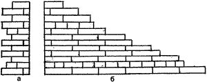 Фундаменти з бутового каменя викладають, починаючи з самого нижнього по рівню залягання ділянки. Перепади рівнів заставляння підошви виконують уступами, в проекті передбачаються перепади, даються відмітки підошви. Кожен уступ виконується з двох лав кладки, що складає близько 35–60 см. Камені верхнього ряду уступу перев'язуються з нижнім поряд вищерозміщеної кладки. Кладка ведеться ярусами 0,8–1,0 м. Висота розриву на межах окремих ділянок не повинна перевищувати 1,2 м. Розриви кладуть у вигляді вертикальної (рис. 4, а) або втікаючої штраби (рис. 4, б) уступами, де висота до довжини відноситься як 1:2 або 1:1.
