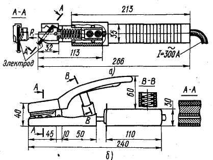 Для затискання електроду і підведення до нього зварювального струму служить електродотримач. Досконалішими є електродотримачі з пружинами (рис. 22); застосовуються також гвинтові, пластинчасті, вилки і інші типи електродотримачів.