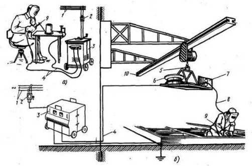 а) – ручне зварювання від зварювального трансформатора або зварювального випрямляча; б) – зварювання шланговим напівавтоматом; 1 – мережа електроживлення; 2 – рубильник або магнітний пускач; 3 – джерело живлення дуги; 4 – зварювальні дроти; 5 – підвіска напівавтомата; 6 – котушка з електродним дротом; 7 – механізм подачі дроту; 8 – шланг для подачі електродного дроту; 9 – пальник або електродотримач; 10 – консолі з рейкою.