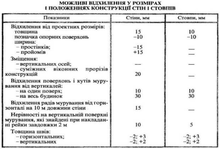 У таблиці 2 наводимо можливі відхилення у розмірах і положеннях конструкції стін і стовпів. Відхилення розмірів і положень конструкцій не повинні перевищувати значень, які вказані у таблиці. Якщо відхилення перевищують допуски, передбачені БНіП, або допущені відхилення від проекту, така робота потребує виправлення.