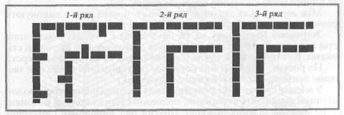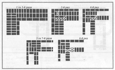 Рис. 43. Порядкове розташування цегли при муруванні прямого кута стіни з трирядними діафрагмами