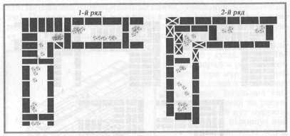 На рисунку 45 показане порядкове розташування цегли при зведенні прямого кута колодязного мурування.