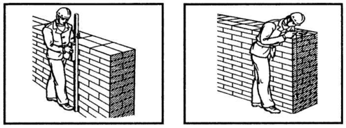 Вертикальність поверхонь стін і кутів мурування перевіряють рівнем і виском не рідше двох разів на кожному ярусі мурування (рис. 54). Відхилення, яке перевищує можливе, виправте під час мурування наступного ярусу або поверху.