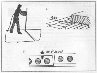 Плита з обох боків повинна мати однакові розміри площі опирання. Глибина опирання має бути не менше 100 мм (рис. 49а). Під час укладання плити перекриття необхідно стежити, щоб стеля у приміщенні була горизонтальною і перепади по висоті не перевищували 3 мм (рис. 49б). Якщо встановлену конструкцію необхідно перекласти, її піднімають, очищають від розчину й встановлюють заново.