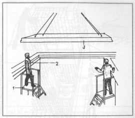 Наступні плити вкладають подібно до першої. Двоє монтажників приймають плиту, подану краном, не послаблюючи натягу віток стропа, спрямовують її у проектне положення (рис. 48).