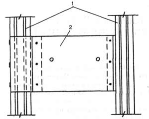 В случае, когда масса навешиваемого груза составляет 70—150 кг на один погонный метр, следует заранее предусмотреть установку закладных деталей или траверс. Их устанавливают между стойками каркаса и крепят в процессе монтажа. Чтобы конструкция была более надежной, нужно применять универсальную деревянную траверсу, закрепленную к стойкам каркаса (рис.).