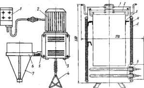 Электроклееварка С-409 (рис.11). В бак 4 вставляется сменный бак 3 вместимостью 16 л (ведро) для клея. В нижней части 0ака помещены электронагревательные элементы ЭТ-80 мощностью 3,6 кВт. Между баками заливают воду, включают электронагревательные элементы 6 и нагревают воду до 100 °С. Нагретая вода предохраняет клей при варке от пригорания. Сливают воду из бака через кран в нижней части. Время приготовления клея 1,5...2 ч.