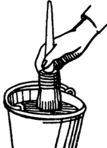 Проолифка поверхностей с помощью кисти (кисть-ручник, лестница-стремянка, ведро с олифой; рис.4,5). Маляр берет кисть за ручку, не охватывая пальцами обойму, погружает ее в ведро с олифой на глубину 1/4 цайга (рабочей части), отжимает избыток краски о край ведра и наносит олифу широкими ровными мазками, держа кисть перпендикулярно обрабатываемой поверхности.