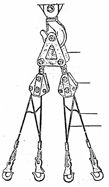 Через блоки перекинуты стропы, образующие чалочные ветви, которые соединяются попарно взаимодействующими с ними уравнительными канатами и страховочными перемычками. На концах чалочных ветвей расположены крюки с карабинами для их отцепки.