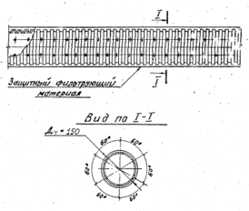 Водоприемные отверстия в трубах следует устраивать в виде пропилов шириной 3-5 мм. Длина пропила должна быть равна половине диаметра трубы. Пропилы устраивают с обеих сторон трубы в шахматном порядке. Расстояние между отверстиями на одной стороне - 50 см. Имеется вариант с просверливанием водоприемных отверстий