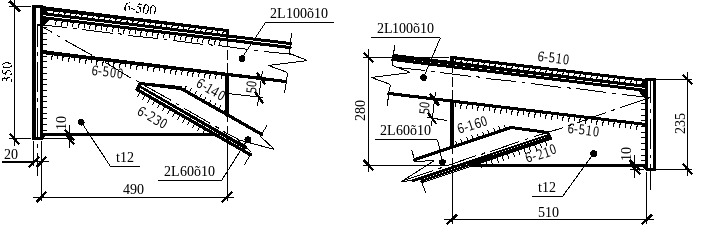 Нижний растянутый пояс (элементы 6, 12) - примем 2 равнополочных уголка L100х12 по ГОСТ 8509-93.