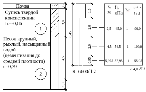 Наиболее благоприятным грунтом для использования в качестве несущего слоя является супесь, но мощности слоя не достаточно. Используем в качестве несущего слоя песок. Принимаем глубину заделки сваи в ростверк z=0.05м, в несущий слой грунта hz=2,95м. Требуемую длину сваи определяем по формуле 9,4/