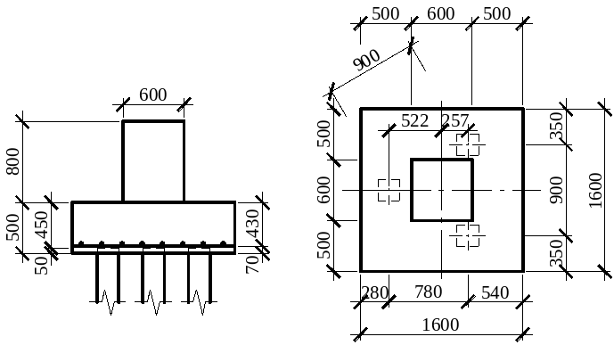 Проверяем давление на грунт по подошве фундамента pII=432,79кПа Природное давление на уровне подошвы условного фундамента Дополнительное давление по подошве условного фундамента Вычисляем природные и дополнительные напряжения в основании (таблица 8.15.) и строим эпюры этих напряжений (см. рис. 8.21.) для η=lc/bc=1 и hi=0,4bc =0,384м. Вычисление природных и дополнительных напряжений под подошвой условного фундамента колонны К1. Таблица 8.15 № границ слоев Грунт z,м m=2z/ bc α σzg, кПа σzр, кПа σzр,m, кПа 0 Песок Е0=30МПа 0 0 1,000 116,87 315,92 - 1 0,384 0,8 0,800 124,01 252,70 284,29 2 0,768 1,6 0,449 131,15 141,83 197,27 3 1,152 2,4 0,257 138,30 81,18 111,51 4 1,536 3,2 0,160 145,44 50,54 65,86 5 1,92 4,0 0,108 152,58 34,11 42,33 Мощность сжимаемого слоя Yc=1,92м, так как на границе его выполняется условие 6,15[9] 0,2σzg=0,2*152,58=30,52кПа ≈ σzр=34,11кПа. Осадку вычисляем по формуле 6,14 Осадка фундамента 0,7см меньше предельно допустимой осадки фундаментов su=12см производственных зданий с металическим каркасом. Рис. 8.21 Расчетная схема к определению осадки свайного фундамента под колонну К1. 8.5.3 Проектирование фундамента под колонну К2. 1. Исходные данные. Наиболее невыгодное сочетание нагрузок на уровне обреза фундамента N=696,83кН, М= 76,79кН*м, Q=20кН. 2. Выбор глубины заложения ростверка, несущего слоя грунта и конструкции сваи. Расчет см. п.8.5.2. 3. Определение несущей способности и силы сопротивления сваи по материалу и по грунту. Расчет см. п.8.5.2. 4. Определение приближенного веса ростверка и числа свай. По формулам 9,23[9] и 9,24[9] определяем соответственно среднее давление под подошвой ростверка pg, площадь подошвы ростверка Ag и приближенный вес ростверка с грунтом на уступах Ng, учитывая, что здание без подвала, среднее значение удельного веса материала ростверка и грунта на его уступах γm = 20кН/м3, Число свай определяем по формуле 9,25[9] где Принимаем число свай 3шт. 5. Конструирование ростверка. Расстояние от края ростверка до внешней стороны сваи: е = 0,2·d +5 = 0,2·0,3 + 5 = 11см =0,11м. Ширина ростверка: 2·е + d = 2·11 + 30 = 52см = 0,52м. Высота ростверка: h = h1 + h2 ; h2 = 5см = 0,05м. Высоту h1 определяем из условия прочности на продавливание ростверка сваей: h = 0,34 + 0,05 = 0,39м. Размещаем сваи в плане таким образом, чтобы рассояние между их центрами было не менее 3d. Тогда размеры плиты ростверка в плане оказываются равными 1,6х1,6м. По высоте принимаем h=0,5м, высоту подколонника 0,8м (см. рис. 8.22.). Рис. 8.22 Конструкция ростверка свайного фундамента под колонну К1. Вес ростверка Ng и грунта Ngg на его уступах определяем по формулам 9,27[9] и 9,28[9], учитывая , что γf=1,1-коэффициент надежности по нагрузке для собственного веса материала; γb=24 кН/м3 – удельный вес железобетона; γ1=16 кН/м3 – удельный вес насыпного грунта, расположенного выше ростверка, Армирование ростверка конструктивное, сеткой с ячейками 200х200 12, кл. A-I. 6. Проверка усилий передаваемых на сваи. При действии момента, наиболее нагруженными оказываются сваи, максимально удаленные от центра тяжести свайного поля (в рассматриваемом случае yi=0,522). Вычисляем суммарную расчетную нагрузку на сваю в уровне подошвы ростверка и момент в уровне подошвы ростверка. Расчетное усилие, передаваемое на сваю, определяем по формуле 9,2 Проверку расчетных усилий, передаваемых на сваи, выполняем по условию 9,1 Np max=259,41+51,79=311,2кН< RRs=642,04кН, Np min=259,41 51,79=207,62кН Все сваи сжаты, максимальное расчетное усилие на сваю не превышает силы расчетного сопротивления сваи. 7. Расчет осадок фундамента. Проверку давления на грунт выпо