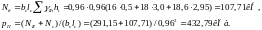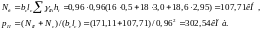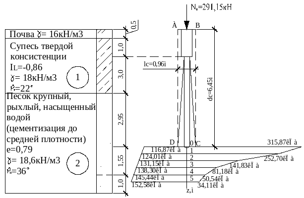 Вес условного фундамента Nc и давление на грунт по его подошве pII вычисляемпо формулам 9,41[9] и 9,42[9], используя значения удельного веса γIIi отдельных слоев грунта толщиной hi, в пределах глубины заложения условного фундамента dc (см. рис.8.21.) и нагрузку на фундамент II группы предельных состояний NII=NI/γf=349,38/1,2=291,15кН (где γf=1,2 – среднее значение коэффициента надежности по нагрузке),