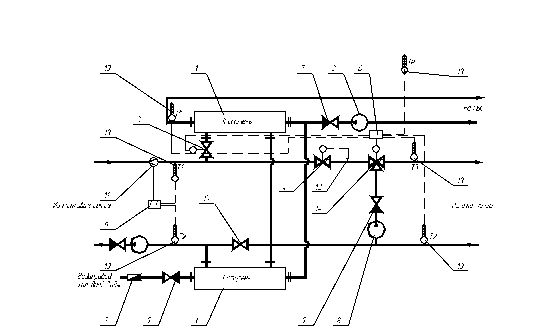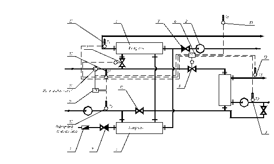 Учитывая меньшие капитальные и эксплуатационные затраты к рассмотрению принята первая схема. Приготовление воды для нужд горячего водоснабжения осуществляется при этом в двухступенчатом теплообменнике. Приготовление теплоносителя для системы отопления производится с помощью смесительного клапана 14 и подмешивающего насоса 8. Снижение давления теплоносителя до допустимого в местных системах производится клапаном 4.
