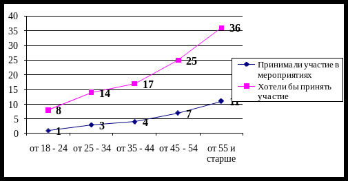 Данные рисунка 9 показывают распределение участвовавших в мероприятиях по благоустройству и желающих участвовать в них в зависимости от возраста.