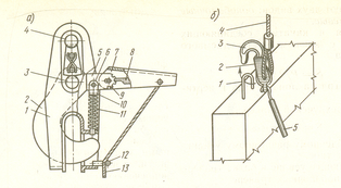 а – полуавтоматический захват для дистанционной расстроповки; 1 – обойма, 2 – специальный крюк, 3 – палец крюка, 4 – палец соединения захвата со стропом; 5 – рычаг; 6 – направляющий стержень с вилкой; 7 – рукоятка; 8 – пружина растяжения; 9 – фиксатор; 10 – тарелка; 11 – распорная пружина; 12 – скоба; 13 – строповочный шнур; б – схема устройства для дистанционной расстроповки: 1 – монтажная петля; 2 – карабин; 3 – крюк; 4 – строп; 5 – тяга