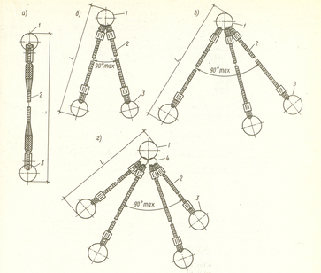 а – одноветвевой, б – двухветвевой, в – трехветвевой, г – четырехветвевой стропы; 1 – звено для навешивания стропа, 2 – канатная ветвь, 3 – звено для захвата груза, 4 – переходное звено