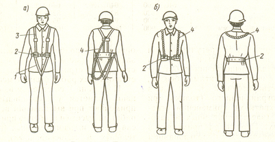 а – лямочные; б – безлямочные; 1 – ножные лямки; 2 – пояс; 3 – плечевые лямки; 4 – строп с карабином