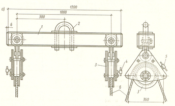 1 – балансирная балка; 2 – серьга для грузоподъемного механизма; 3 – ролик; 4, 5 – винты, 6 – стропы