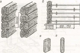 Для повышения устойчивости стен и сруба дома в целом смежные по высоте бревна скрепляют между собой деревянными вставными плоскими или круглыми шипами (рис.1.3).