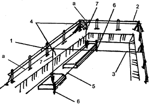 До початку монтажних робіт необхідно перевірити правильність розбиття осей будівлі - цю роботу виробляють геодезисти або інженер-будівельник. Розбиття осей - це перенесення осей з креслення на підставу, призначену для пристрою фундаменту. З дерев'яних кілочків і рейок виконується обноска (2), натягаються струни осей (3) і схилами (7) визначають точки пересічення осей (4) на дні котловану. За допомогою крапок, що визначилися раніше, заміряють проектні розміри фундаменту і закріплюють їх металевими штирями (6), аби не змістилися. Причалювання (5) повинне знаходитися на 2-3 мм далі за бічну грань стрічкового фундаменту. Фундаменти під колони і стовпи владнують так само, як і стрічкові, але, крім того, розмічають грані і кути фундаментів.