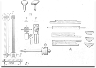 а) стальные марки; б) инвентарные металлические маяки; в) малки.
