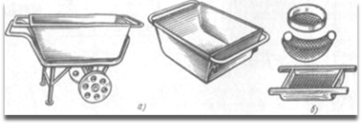 Наиболее удобны инвентарные металлические тележки с емкостью для раствора. Они состоят из тележки с ручкой, двумя ножками и двумя колесами, на которую устанавливают съемнь ящики вместимостью до 0,09 м3.
