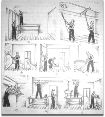 а) провешивание и устройство маяков; б) нанесение раствора на потолки и его разравнивание; в) нанесение раствора на стены; г) разравнивание раствора на стене; д) уборка раствора с пола; е) вытягивание тяг и разделка углов; ж) снятие правил и отделка откосов; з) нанесение беспесчаной накрывки и ее заглаживание.
