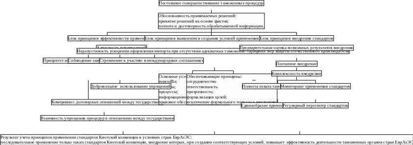 После создания достаточных условий применения стандартов Киотской конвенции осуществляется их поэтапное внедрение, основанное на предварительной оценке возможных результатов применения стандартов, их экспериментальном внедрении оценке изменений в динамике показателей деятельности таможенных органов с помощью применения методов статистического анализа данных и распространении стандарта в случае его успешного применения. Каждый блок принципов нацелен на достижение конечного результата – обеспечение последовательного применения только таких стандартов Киотской конвенции, внедрение которых, при создании соответствующих условий, повышает эффективность деятельности таможенных органов.
