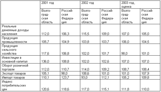 Темпы роста основных социально-экономических показателей Волгоградской области в сопоставимых ценах в сравнении с Российской Федерацией представлены в таблице 3.1: