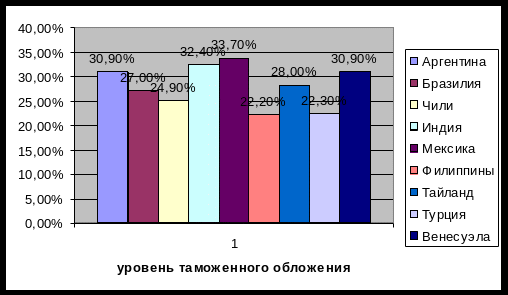 Средний уровень таможенного обложения в развитых странах и в части развивающихся государств заметно понизился в последние три десятилетия. Это привело к довольно распространенному мнению, что мир вступил в новую эпоху свободной торговли. Однако, нет ничего более ошибочного, чем эта точка зрения. Дифференцированная товарная номенклатура таможенного тарифа позволяет, при сравнительно невысоком среднем уровне обложения, устанавливать высокие тарифные ставки (тарифные пики) на многие отдельные товары международной торговли. Например, при среднем уровне обложения 3-4% уровень таможенного обложения на текстиль и одежду в США – 14,6%; 9,1% – в Евросоюзе, 7,6% – в Японии. На отдельные товары этот уровень существенно выше. В США, например, 52% импортированного текстиля и одежды облагаются пошлинами до 35 %; 19% импорта химических товаров облагаются ставками до 10 %. В Евросоюзе 54% ввозимого текстиля и одежды облагаются ставками до 15 процентов; 60% ввозимых средств транспорта ставками до 10%. Не менее высок уровень таможенного обложения в развивающихся государствах. Средний взвешенный уровень таможенного обложения в конце 90-х годов (после реализации снижения пошлин в итоге Уругвайского раунда) приведен на рис. 1.2. Этот уровень в два раза и более превышает средний уровень таможенного обложения в России.