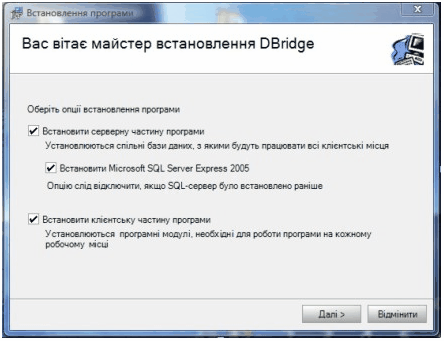 Крок 1. Якщо ви є користувачем операційних систем Windows 2000 або Windows ХР без встановленого сервісного пакету оновлень SP2, встановлення програми слід починати з запуску файлу install.bat, розміщеного в каталозі dbrinst. Це пов’язано з необхідністю перевірки, та за відсутності, встановлення поновленої версії інсталятора Windows Installer та .NET Framework 2.0.