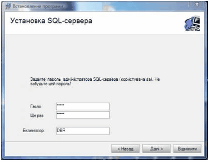 Якщо ви обрали опцію «Встановити Microsoft SQL Server», Майстер встановлення попросить ввести пароль адміністратора SQL-сервера. Адміністратором SQL-сервера за замовчуванням є користувач sa. Введення пароля для користувача є обов’язковим. В подальшому засобами програми ви можете створити або призначити і додаткових адміністраторів сервера.