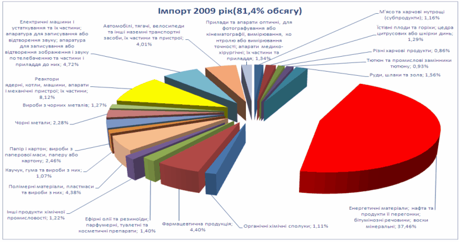 Рис.Е.1. Структура питомої ваги вартості основних товарних груп імпорту в Україну за 2009 рік (81,4% від загального обсягу імпорту по 96 товарним групам на загальну суму 48,857 доларів США)