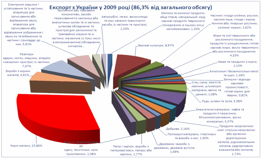 Рис.Е.2. Структура питомої ваги вартості основних товарних груп експорту з України за 2009 рік (86,3% від загального обсягу імпорту по 96 товарним групам на загальну суму 39,649 доларів США)