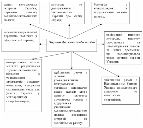 Для виконання зазначених завдань Державна митна служба України, як центральний орган виконавчої влади зі спеціальною компетенцією та головна ланка системи митних органів України [8]: організовує та контролює діяльність митних органів; забезпечує своєчасне і повне внесення до державного бюджету коштів від податків, зборів (обов'язкових платежів), справляння яких згідно із законодавством покладено на митні органи; вживає разом з іншими органами виконавчої влади заходів, спрямованих на недопущення незаконного вивезення за кордон цінностей, що становлять культурне або історичне надбання українського народу; розробляє та здійснює самостійно або у взаємодії з іншими органами виконавчої влади заходи щодо запобігання контрабанді, порушенню митних правил та їх припинення; організовує та контролює відповідно до законодавства проведення митними органами дізнання у справах про контрабанду та здійснення ними провадження у справах про порушення митних правил; веде митну статистику; здійснює верифікацію (встановлення достовірності) сертифікатів про походження товарів з України; забезпечує в межах своєї компетенції реалізацію державної політики стосовно державної таємниці, контроль за її збереженням у системі митних органів України; створює, реорганізовує та ліквідує в установленому порядку регіональні митниці, митниці, спеціалізовані митні управління та організації, установи і навчальні заклади; забезпечує гласність у діяльності митних органів, здійснює в установленому законодавством порядку інформування суб'єктів зовнішньоекономічної діяльності та громадян з питань митного законодавства; виконує інші функції, що випливають з покладених на неї завдань.