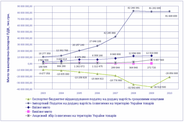 - абсолютний рівень імпортного ПДВ у 2003 – 2009 роках систематично перевищував рівень експортного бюджетного відшкодування ПДВ, при цьому у 2009 році співвідношення досягло значень 81 млрд.грн. (імпортний ПДВ) на -36,5 млрд.грн. (бюджетне відшкодування). У 2010 році в проекті Державного бюд-жету прогнозується різке зменшення бюджетного відшкодування ПДВ з рівня -36,5 млрд.грн. у 2009 році до рівня -20 млрд.грн. у 2010 році, при цьому рівень імпортного ПДВ прогнозується практично на рівні 2009 року;