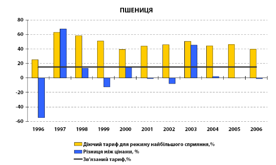 Рис. 3.1 - Пшениця. Порівняння цін та тарифів, 1996–2006 рр. [48]