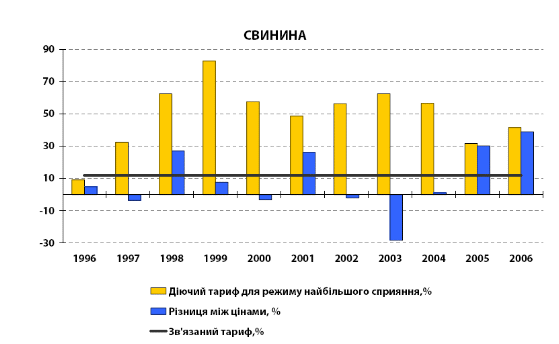 Рис. 3.4 - Свинина. Порівняння цін та тарифів, 1996–2006 рр. [48]