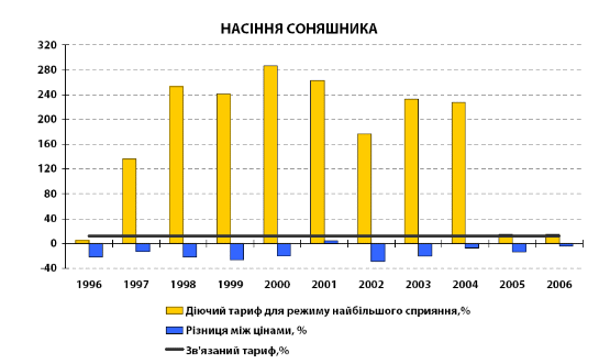 Імпортний тариф, що діяв в 1997–2004 рр., був встановлений на необґрунтовано високому рівні 500 євро за 1 тонну, що складало 250 % в перерахунку на адвалерне в 2000 році, та 227 % в перерахунку на адвалерне в 2004 р. (Рис.3.2). Аналіз різниці цін показав, що ставка імпортного тарифу на насіння соняшника, яка може бути після вступу України до СОТ, є достатньою для забезпечення конкурентоспроможності за ціною вітчизняної сировини порівняно з імпортною. Для олійно-переробних заводів соняшник вітчизняного виробництва залишатиметься за ціною більш привабливим, ніж імпортний. З липня 2005 року ставку ввізного мита на насіння соняшника вже знижено до 15%, при цьому річні обсяги імпорту насіння соняшника після зниження тарифу становили лише 4 тис. тонн, що менше, ніж у попередні роки. Таким чином, багаторазове зниження імпортного тарифу на насіння соняшника не вплине на зниження обсягів виробництва та доходи сільськогосподарських виробників від його реалізації.