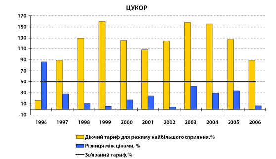 Крім того, внутрішній ринок цукру після вступу до СОТ буде захищений тарифною квотою у розмірі 260 тис. тонн зі сплатою мита не вище 15 відсотків. Понад тарифну квоту, тобто на обсяг імпорту цукру-сирцю з тростини, що перевищує 260 тис. тонн, діятиме високий тариф 50%. У суспільстві сприйняття тарифної квоти на цукор-сирець дещо викривлене. Тарифна квота — це захід не додаткового відкриття ринку, а навпаки — захід захисту ринку, бо обсяг можливого імпорту обмежений кількісним розміром квоти, а вище квоти діє високий імпортний тариф. Із світової практики відомо, що товарна лінія є менш захищеною у випадку простого зниження тарифу на весь обсяг імпорту порівняно із застосуванням тарифної квоти.