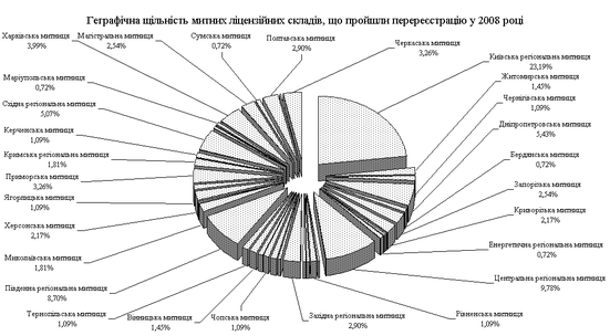 Рис.2.1 - Діаграма географічного розподілу митних ліцензійних складів на території України у 2008 році