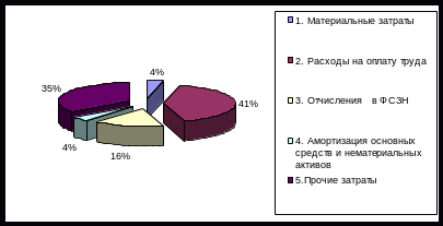 Анализ себестоимости по элементам позволяет изучить состав затрат и охарактеризовать структуру себестоимости. Рассмотрим доли каждой статьи затрат в общем объеме за 2008 г.
