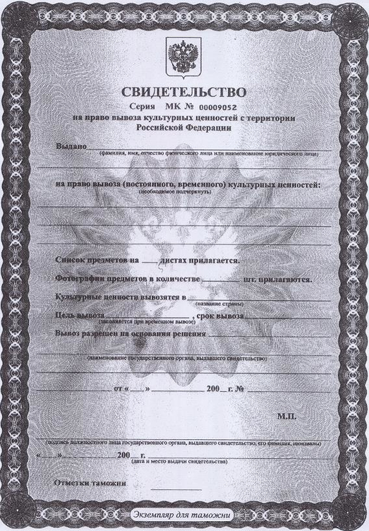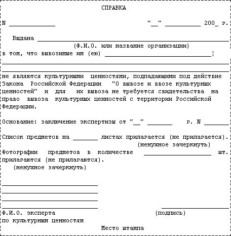 Форма Справки на вывоз предметов культурного назначения с территории РФ.