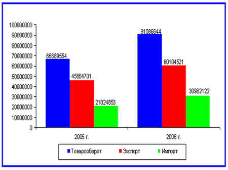 В 2006 году внешнеторговый оборот через таможни СЗТУ составил 91086,6 млн. долларов США, что на 37% больше объема оборота за 2005 год. Объем экспорта составил 60104,5 млн. долларов США, а импорта – 30982,1 млн. долларов (рис. 7). Экспорт увеличился на 32%, импорт – на 47%. Сальдо торгового баланса выросло в 1,2 раза (табл. 1).