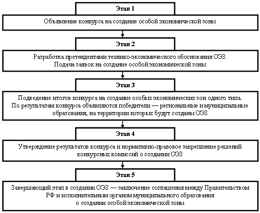 Процедура создания особой экономической зоны определена Положением о проведении конкурса по отбору заявок на создание особой экономической зоны, утвержденным Постановлением Правительства РФ от 13.09.2005 г. №563, и включает в себя 5 основных этапов (рис. 1) .