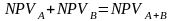Показатель чистого дисконтированного дохода учитывает стоимость денег во времени, имеет четкие критерии принятия решения и позволяет выбирать проекты для целей максимизации стоимости компании. Кроме того, данный показатель является абсолютным показателем и обладает свойством аддитивности, что позволяет складывать значения показателя по различным проектам и использовать суммарный показатель по проектам в целях оптимизации инвестиционного портфеля, т. е. справедливо следующее равенство
