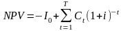 где I0 — величина первоначальных инвестиций, Сt — денежный поток от реализации инвестиций в момент времени t; t — шаг расчета (год, квартал, месяц и т. д.); i — ставка дисконтирования; Т – период реализации проекта.